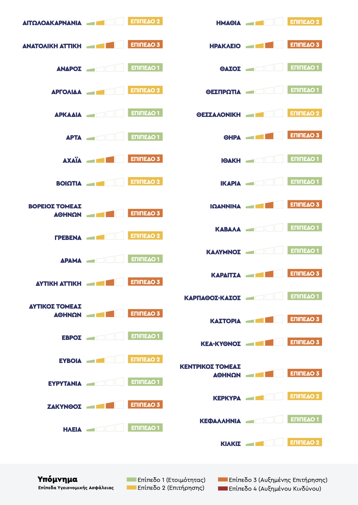 Ο χάρτης υγειονομικής ασφάλειας και προστασίας από τον κορωνοϊό (στην ιστοσελίδα https://covid19.gov.gr) όπως προαναφέρθηκε περιλαμβάνει 4 επίπεδα προληπτικών μέτρων και κανόνων για κάθε περιφερειακή ενότητα της χώρας: